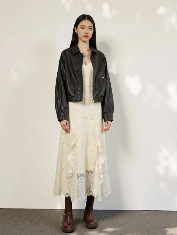 短款机车夹克:收腰设计凸显腰线,搭配高腰裤或长裙,瞬间拉长腿部比例;金属拉链与铆钉装饰点缀,增添酷感却不浮夸,适合日常出街或轻社交场合。